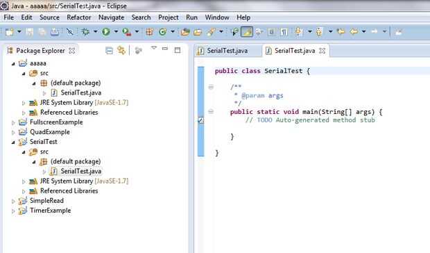 Ahora que ha instalado la biblioteca de RXTXcomm, podemos comenzar la codificación en Eclipse. Ábrala e ir archivo > Nuevo > proyecto... > proyecto Java. Aras de la simplicidad y facilidad, este proyecto SerialTestnombre. Mientras que esto puede no ser el método apropiado, no hay ninguna razón para que no funcione de esta manera. Haga clic en Finalizar. En la barra lateral la explorer del paquete, haga clic en la carpeta SerialTest e ir Nueva > clase también se nombre este SerialTest. Asegúrese de que público principal vacío estático (string [] args) se comprueba. Este es un programa Java en su forma más simple, sin embargo, todavía tenemos que importar las bibliotecas de antes. Haga clic derecho en la misma carpeta del proyecto e ir Build Path > Configure construir reinado La sección de bibliotecas , haga clic en Añadir frascos externos y navegar a donde pones el RXTXcomm.jar ([su trabajo] / lib/tarros) y abrirlo. Haga clic en Aceptar. Ahora estás listo para empezar a programar Java usando la librería de comunicación serial.