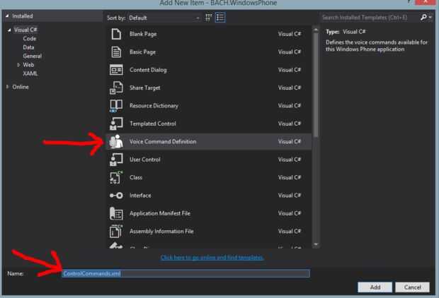 - Figura 2 - Desplácese hasta encontrar la plantilla de la Definición de comando de voz y crear con un nombre. He nombrado a mi ControlCommands.xml