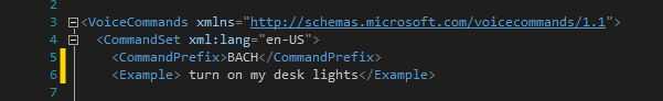 La etiqueta de 'CommandPrefix' es lo que ya hemos hablado en el último paso: nombre de la aplicación como es conocido por Cortana. Esto no realmente aún tiene para ser el nombre de su aplicación real, podría ser cualquier cosa. Te sugiero algo fácil que vas a recordar. Recuerde que nombré esta aplicación ' B.A.C.H "así que voy a insertar 'bach' como mi CommandPrefix.