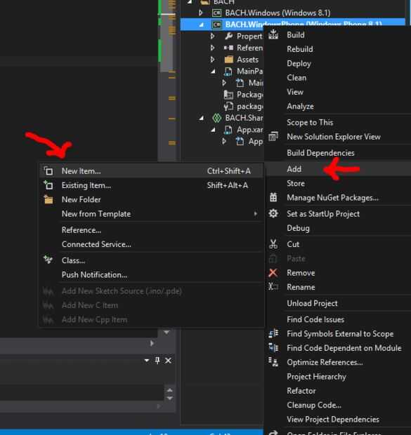 - Figura 1 - haga clic en el proyecto WP8.1 la derecha, haga clic en Agregar y luego el Nuevo artículo