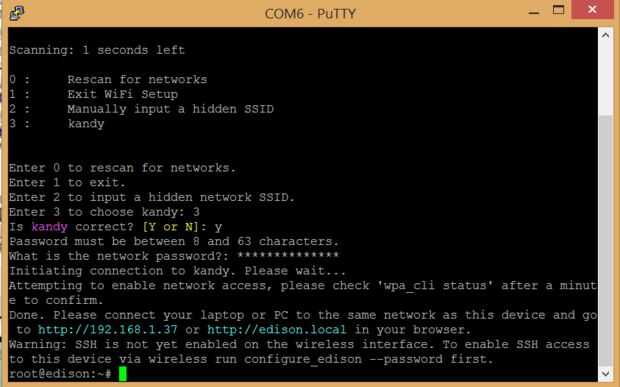 Edison buscará todas las redes Wi-Fi durante aproximadamente 10 segundos. Cuando haya terminado, se mostrará una lista de redes disponibles. Elegir la red por el número correspondiente en la lista, tipo Y y presione Intro. Pedirá las credenciales de red, escriba credenciales válidas y se conectará a la WiFi con su Edison.In su navegador escriba la dirección IP de su Edison o "http://edison.local" Esto mostrará esta página si su Edison está conectado a la red. Ahora estamos todo hechos para empezar a desarrollar con nuestro proyecto de Edison.