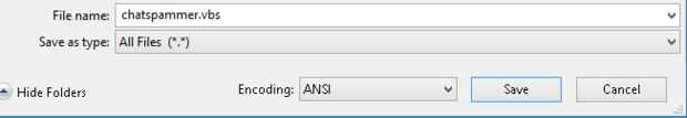 Podrías "Copiar & pegar" el código en "Bloc de notas" luego elige "Guardar como" selecciona "Todos los archivos" y luego el nombre "chatspammer.vbs" o podría simplemente descargarlo a continuación.