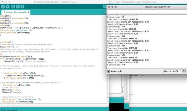 Aquí está el código para cargar en el Arduino. Usted necesitará instalar la biblioteca de clases de cronómetro. La biblioteca LCD ya estará en las bibliotecas de distribución por defecto que viene con el Arduino. Nota que para obtener lecturas precisas de la velocidad, tendrá que cambiar la variable RunwayLength para que coincida con la distancia entre el interruptor y el fotosensor: no el B-Daman sí mismo! Recuerde, es calcular el tiempo entre la rotura de la viga de la luz y el interruptor.