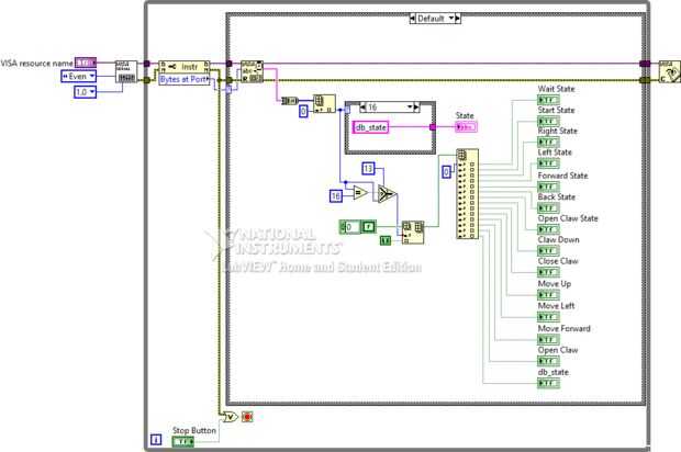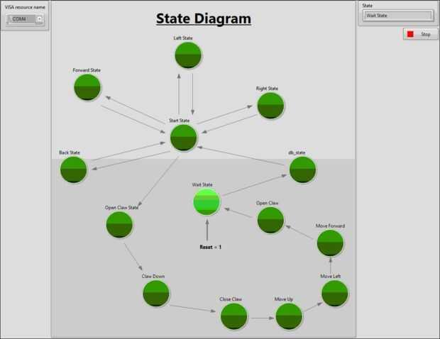 Para crear una interfaz gráfica para el juego de garra, se utilizó un ordenador con LabVIEW y NI VISA . NI VISA permite LabVIEW leer/escribir los datos en serie.