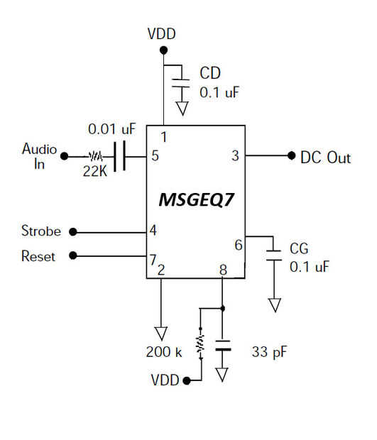 El IC MSGEQ7 es una banda de siete solo canal filtro de pantalla de ecualizador gráfico. Por la alimentación de una señal de audio a la misma, filtrará siete bandas de frecuencia centrado alrededor de 63Hz, 160Hz, 400Hz, 1, 000 Hz, 2, 500 Hz, 6, 250Hz y 16, 000Hz.