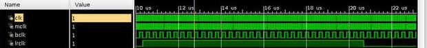 El primer módulo que necesitaremos es un controlador de I2S. I2S es un protocolo de comunicación para enviar y recibir datos de audio. El códec de Audio que va a utilizar para convertir señales de audio analógicas a digital que utiliza este protocolo. Vamos a utilizar una frecuencia de muestreo de 48 KHz, que requerirá la señal "mclk" en el chip de audio para ejecutar a 12,288 MHz. La señal de "bclk" se ejecutará en mclk/4. La señal de "lrclk" debe estar ejecutando a 48 KHz, ya que es el reloj de muestra. Una vez tenemos estas señales de corriente y el códec de audio configurado (que pronto llegaremos a), datos saldrá el pin recdata en el chip. No voy a entrar en grandes detalles sobre I2S aquí puesto que hay un montón de cosas buenas en internet, pero la foto de arriba muestra lo que deberían ser los relojes. También, para más información sobre el códec ir al enlace de abajo y buscar en la hoja de datos.