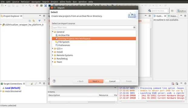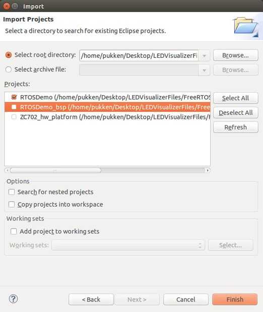 Ir a archivo y seleccione "Importar" en el SDK. Debe saltar una ventana. Seleccione General -> los proyectos existentes en el área de trabajo. Vaya a donde extrajo la copia de FreeRTOS en los archivos suministrados. Ir a FreeRTOSV8.2.1 -> FreeRTOS -> Demo -> CORTEX_A9_Zynq_ZC702. Haga clic en Aceptar. Luego desactive RTOSDemo_bsp y ZC702_hw_platform. A continuación, haga clic en finalizar.