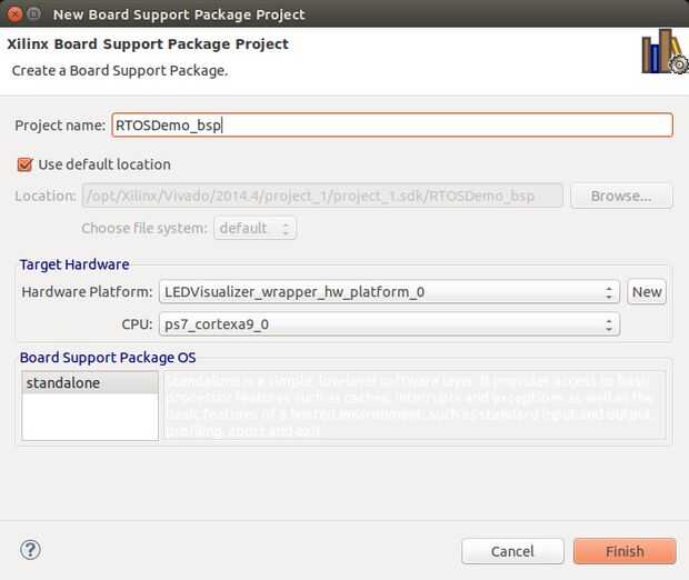 Ahora tenemos que hacer un tablero de soporte de paquete basado en el hardware de Vivado. Vaya a archivo -> Nuevo -> paquete de soporte de junta. Nombre del paquete de soporte de tablero "RTOSDemo_bsp". Haga clic en finalizar. Otra ventana debe subir pero simplemente pulse OK.