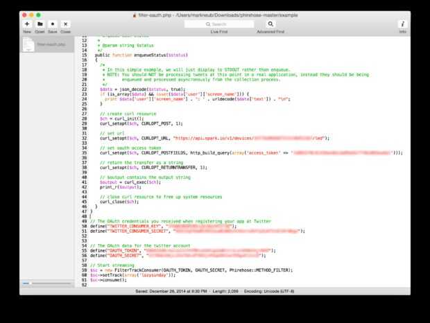 Ahora cambiar el buscador, vaya a su escritorio y abra la carpeta phirehose que se acaba de agregar. Dentro de phirehose debe ser una carpeta llamada ejemplo. Abra el archivo llamado filtro-oauth.php con un editor de texto plano (un bonito gratis, texto editor para Mac que me gusta es Fraise, pero usted puede utilizar el TextEdit incorporado así).