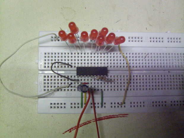 El LED debe conectarse en la dirección correcta. El cátodo va el chip y el ánodo al autobús de la energía (+ 9V) de la placa. En la mayoría de los casos la pierna del cátodo es más corto.