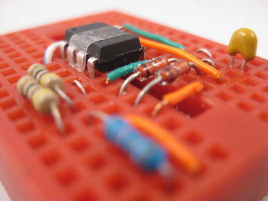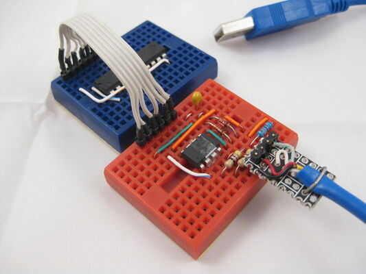 Si está usando vusbtiny para flash en los dispositivos del AVR 8 pines, sólo puede pulsar el dispositivo de destino en la parte superior del dispositivo. el programador había sido diseñado para que coincida con los pines de programación con metas. hay un truco, tendrá que aislar el pin 2 y 3 en el programador mcu, como son el USB ingles y D-pins de conexión al PC. Yo uso un corte de la cinta scotch para lograrlo, se puede ver en las fotos. Mostrar a continuación es un tiny13v "montar" sobre el tiny45, listo para recibir el firmware.