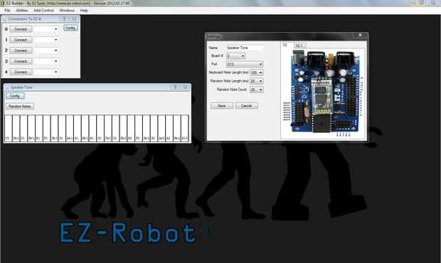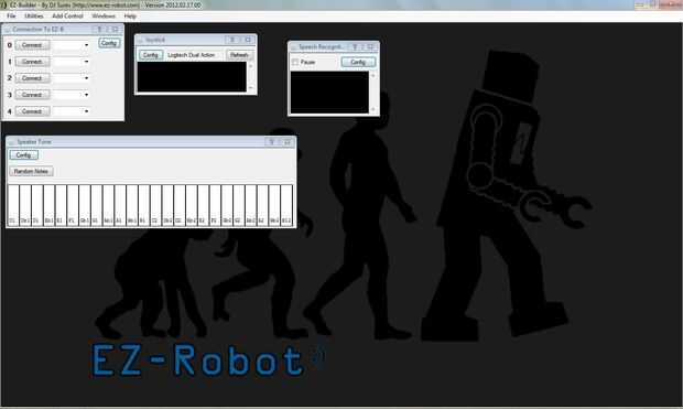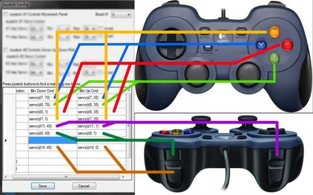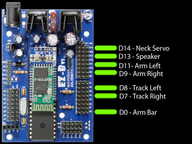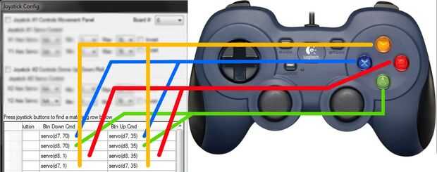 Servos, LED y altavoz fueron asignados a los puertos del controlador y luego fueron controlados sin cables por un joystick USB conectado a un ordenador portátil.