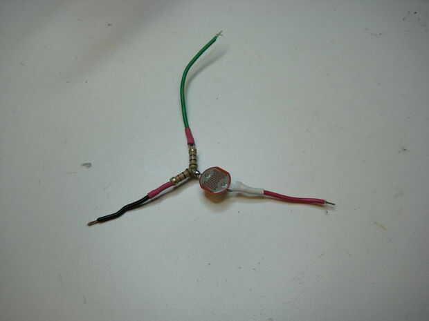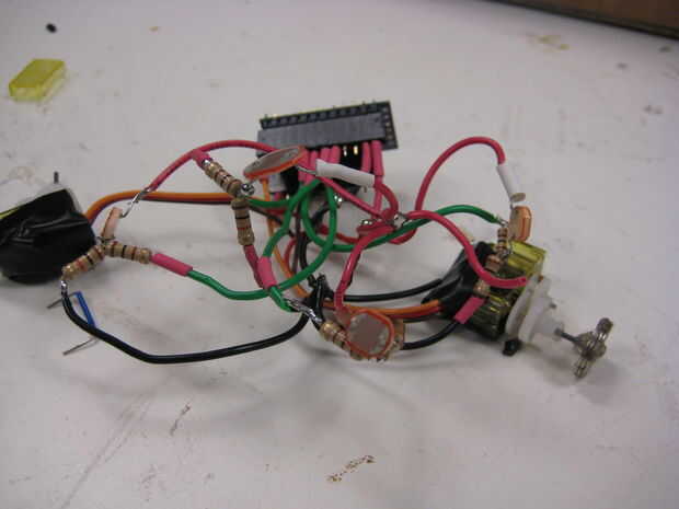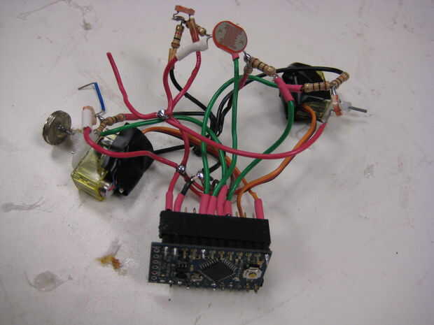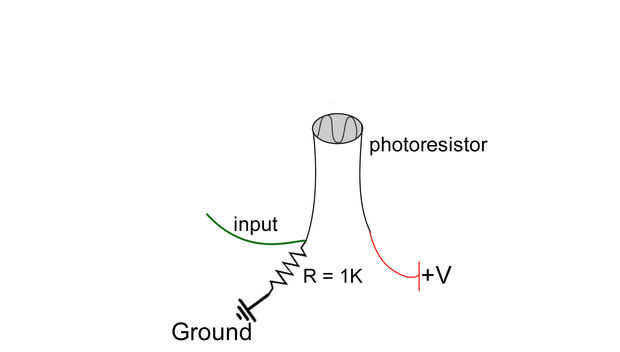 A continuación se muestra el diagrama del circuito para cada sensor de luz. Un cable del sensor va a VCC (alimentación). El otro cable se conecta a los 10K y 100 ohm resistencias. El resistor de 10K se conecta a tierra. el resistor de 100 ohmios se conecta a la clavija de entrada. La entrada (cable verde) de cada sensor va a los pines analógicos mini (A0, A1, A2, A3).