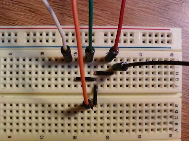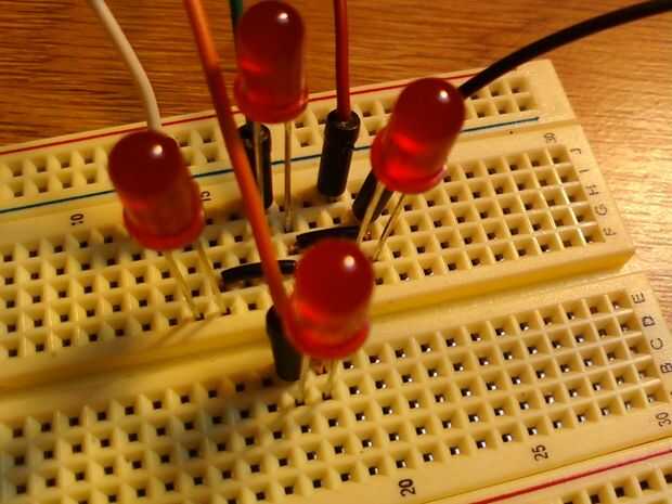 4) ahora es el momento para colocar los leds en el tablero de pan, asegurándose de que la pata corta o el lado plano del LED está en el suelo, y la pata larga es el positivo (o el cable a los pines digitales del arduino) (imagen 4)