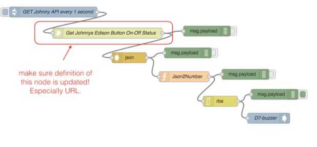 [{"id":"5ecbb367.a1344c","type":"http request","name":"Get Johnnys Edison Button On-Off Status","method":"GET","ret":"txt","url":"http://atlantisjc.local:1880/isbuttoned","x":351,"y":228,"z":"9f7039b8.608fc8","wires":[["11a43181.ee5bce","443cbbb2.bbc344"]]},{"id":"5678e01e.a9872","type":"inject","name":"GET Johnny API every 1 second","topic":"","payload":"","payloadType":"date","repeat":"1","crontab":"","once":false,"x":195,"y":167,"z":"9f7039b8.608fc8","wires":[["5ecbb367.a1344c"]]},{"id":"11a43181.ee5bce","type":"debug","name":"","active":false,"console":"false","complete":"payload","x":638,"y":222,"z":"9f7039b8.608fc8","wires":[]},{"id":"84425c56.7bbda","type":"debug","name":"","active":false,"console":"false","complete":"false","x":749,"y":347,"z":"9f7039b8.608fc8","wires":[]},{"id":"e5365b33.1ac9a8","type":"function","name":"Json2Number","func":"if (msg.payload.isButtoned == 1) {\n msg.payload = 1;\n} else {\n msg.payload = 0;\n}\nreturn msg;","outputs":1,"noerr":0,"x":572,"y":354,"z":"9f7039b8.608fc8","wires":[["84425c56.7bbda","65964c01.9a69b4"]]},{"id":"65964c01.9a69b4","type":"rbe","name":"","func":"rbe","gap":"","x":677,"y":425,"z":"9f7039b8.608fc8","wires":[["e983efdb.167c1","2559d548.daa62a"]]},{"id":"e983efdb.167c1","type":"debug","name":"","active":true,"console":"false","complete":"false","x":833,"y":405,"z":"9f7039b8.608fc8","wires":[]},{"id":"443cbbb2.bbc344","type":"json","name":"","x":414,"y":299,"z":"9f7039b8.608fc8","wires":[["e5365b33.1ac9a8","fa06a34f.05f96"]]},{"id":"fa06a34f.05f96","type":"debug","name":"","active":false,"console":"false","complete":"false","x":583,"y":285,"z":"9f7039b8.608fc8","wires":[]},{"id":"2559d548.daa62a","type":"mraa-gpio-dout","name":"D7-buzzer","pin":"7","set":true,"level":"0","x":816,"y":474,"z":"9f7039b8.608fc8","wires":[]}] En nodo rojo, haz clic en el botón de menú de la parte superior derecha-> Importar -> Portapapeles.