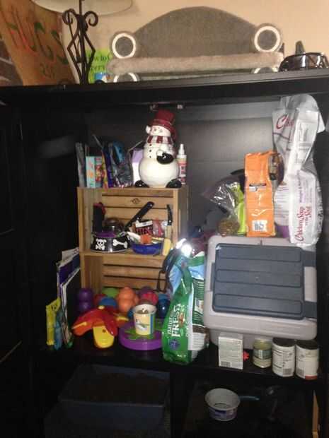 En la parte superior del estante es donde guardamos casi todas nuestras cosas para mascotas. Perros alimentos comida para gatos, documentos importantes, medicinas, golosinas, juguetes, arreglar fuentes y el todo de nuestro erizo así.