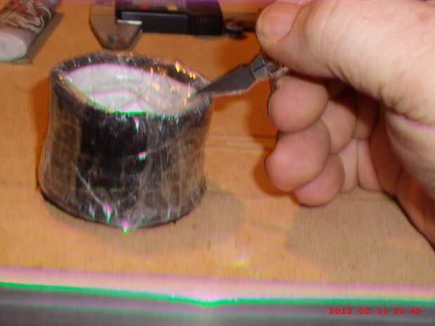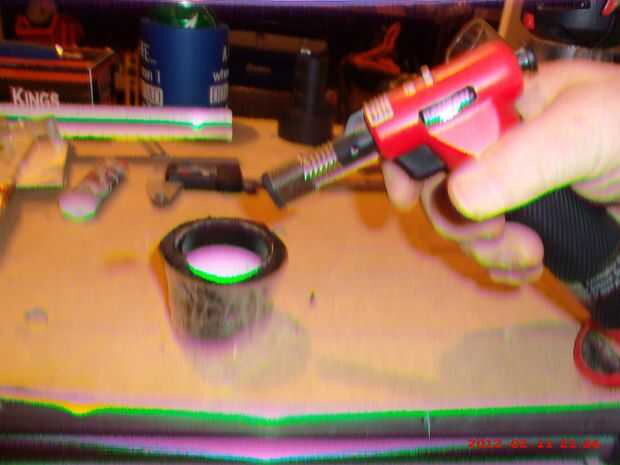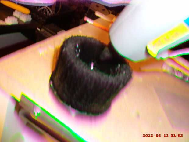 Tomar el cepillo y colocarlo en la mesa (cerda abajo) ahora tomar la antorcha y muy, muy, poco barrido en la parte superior de los anillos y las cerdas. Este paso será bond todo, trate de no fundir su mantenga el calor en la parte superior de la cinta. Cuando esté frío comienzo a quitar la cinta y el forro de cartón, use su cuchilla Xacto, esto te ayudará enormemente. Conecte la pistola de pegamento, colocar la parte superior del cepillo lateral hacia abajo. Lugar 3 o 4 gotas en el interior del anillo y el anillo a las cerdas del enlace. Hacer esto rápidamente el calor del pegamento del pistola derretirá las cerdas. El interior anillo es muy importante si se arruina la aspiradora shop aspirará a las cerdas, o puede conseguir enredados en la broca y destruir su máquina o un proyecto de corte muy importante. Por favor no intente utilizar sin anillo interno. En el siguiente paso.