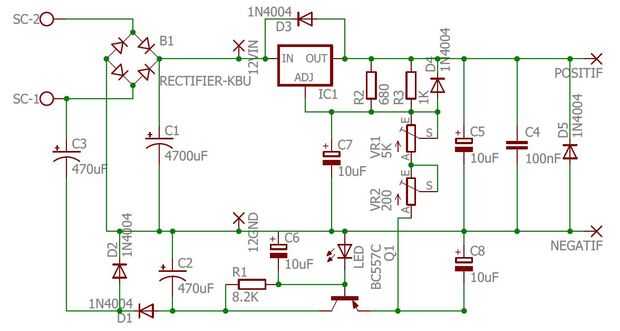 La otra diferencia es el regulador negativo del transistor de paso. Se utiliza para regular el voltaje negativo a una tensión estable. Usar un LED verde como una referencia de tensión y un indicador luminoso. Un diodo Zener de V 2 puede utilizarse siempre y cuando sea capaz de crear una tensión estable cerca de-1.25 V.