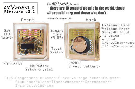 El 01 / \ atch es un reloj binario con una pantalla LED. Las características adicionales son accesibles a través de un sistema de menú desplazable en su matriz de LED 3 x 4. Características actuales incluyen: medidor de voltaje, contador binario, club modo y tiempo de exhibición. El reloj es totalmente programable. Actualizaciones de firmware futuras incluirán: cronómetro/temporizador, alarma, velocímetro/odómetro de bicicleta, registro de datos y un menú de configuración avanzada.