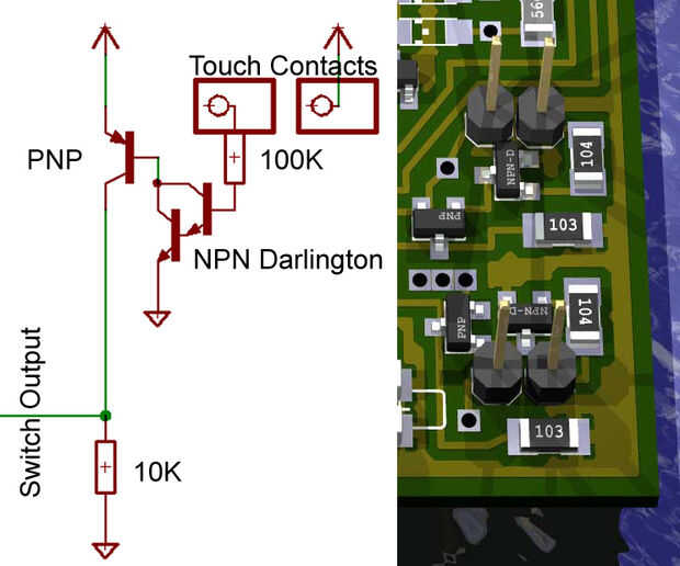 "Un par de Darlington es suficientemente sensible para responder a la pequeña corriente que pasa por su piel y puede ser utilizado para hacer un interruptor de contacto como se muestra en el diagrama. Para este circuito que enciende solo un LED los dos transistores pueden ser cualquier transistores de baja potencia de fines generales. La resistencia de 100kohm protege los transistores si los contactos están vinculados con un trozo de alambre".
