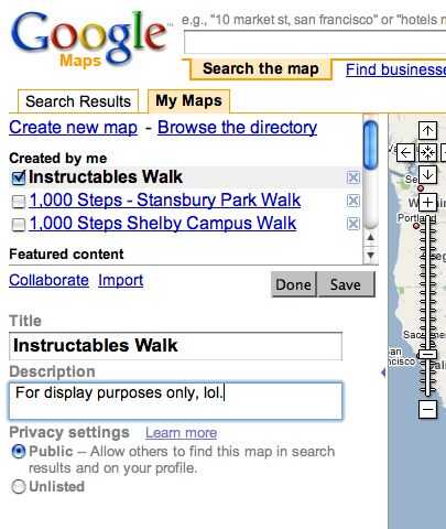 Se le pedirá que introduzca un título y una descripción para el mapa. Tiendo el mapa después de que el lugar que yo voy caminando y la descripción normalmente incluirá el paseo tarda y el número aproximado de pasos!