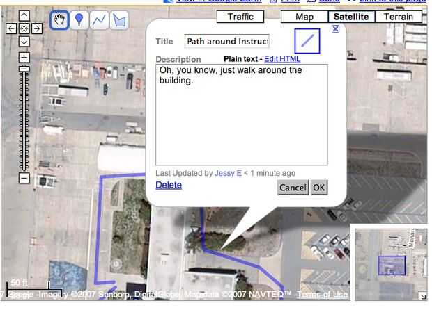 Haga clic para iniciar la línea y haga clic para continuar la línea - sólo líneas rectas son posibles, así que a veces usted tendrá que hacer un montón de pequeñas líneas a la vuelta de una esquina. Haga doble clic para terminar la línea. Cuando haya terminado, un cuadro pop-up y le nombre a la ruta de acceso y escriba una descripción. También puede modificar el color y el grosor de la línea haciendo clic en el icono de la línea en la esquina superior derecha. Esto es útil para documentar la ruta de acceso que no sigue el mismo camino a y desde el punto de partida y. : D