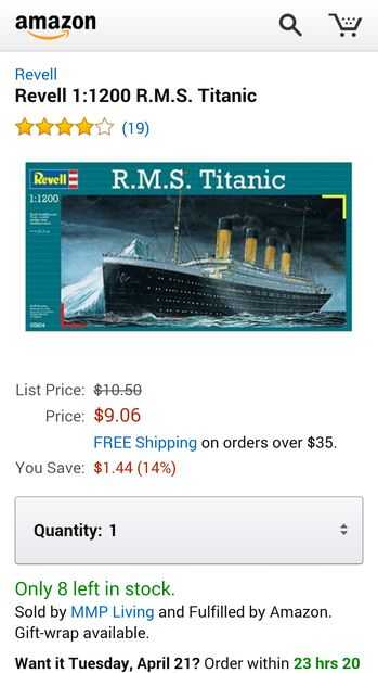 Si vas a este enlace (recomendado) se puede comprar este modelo por un precio razonablemente barato: http://www.amazon.com/Revell-1-1200-R-M-S-Titanic/dp/B0006HJEMC. Lo mucho es que realmente ahorras $1,44!