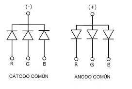 En la imagen de arriba, podemos ver la diferencia entre los RGB de ánodo y cátodo común. Aunque sean muy parecidos, y a la hora de programar la mecánica sea casi idéntica, es una diferencia notable y hay saber, pues si pensamos es de ánodo común cuando es de cátodo común, no nos funcionara.