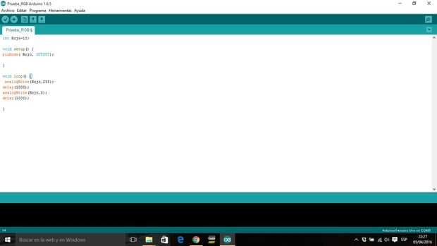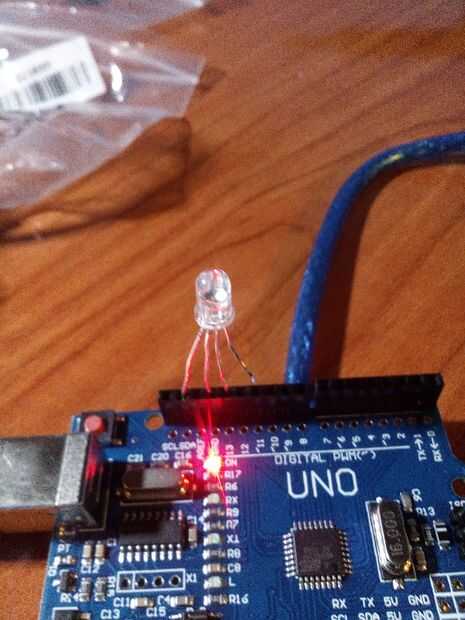 Mi LED RGB es de ánodo común, por lo las conexiones que echo hijo debido a esta configuración. Repito es muy importante comprobéis si el LED RGB es de ánodo o cátodo común, para las conexiones y a la hora de programar. Para ello, basta con el conectar LED de la manera se ve en la penúltima de las imágenes. Colocaríamos la pata común a GND y después cualquiera de las otras 3 al pin 13. Con el programa que se ve en la ultima imagen, probaríamos si hace luz o no. Si hace luz, seria de cátodo común, y si no, seria de ánodo común, conectando el común al pin 13 y una pata a tierra haría luz).
