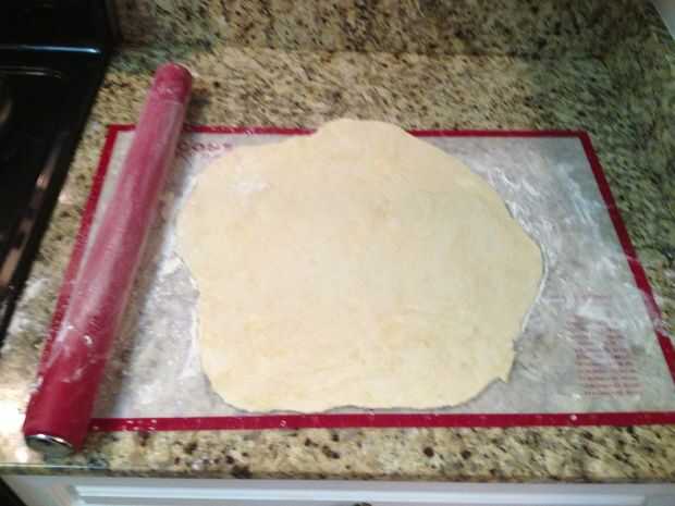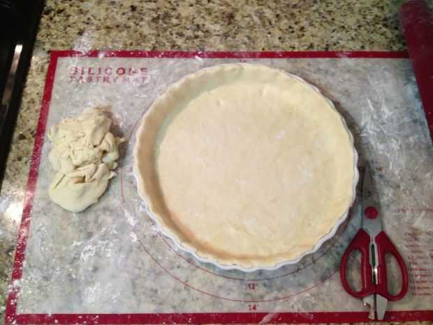 Una vez que su masa está hecha siguiendo la receta de Alice Waters, y lo ha hecho enfriar la nevera adelante y tire de ella. Enharinar ligeramente la superficie de trabajo (rey Arthur Flour por menor es siempre preferido) lugar su masa en la superficie de trabajo y con un rodillo enharinado rodando tu masa en un círculo ligeramente más grande que la tartera, o en mi caso la bandeja de tarta que me decidí a utilizar. Empecé con más masa que necesitaba para que mi ronda termina siendo mucho más grande que lo necesito cubrir mi molde de tarta. Bueno solo a segarla apagado más adelante. Rodillo la masa en el rodillo para levantar para arriba y cuelgue de su tartera de. Una vez que la masa se pone en la tartera de recorte el exceso con tijeras de cocina. Puede utilizar el extra para hacer algunos molinetes yummy.