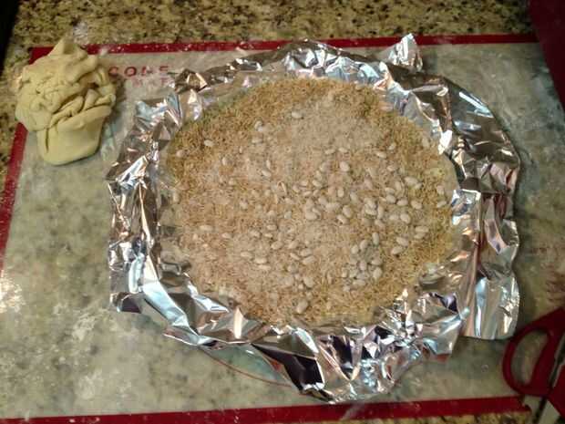 Coloque una capa doble de papel de aluminio sobre la pasta quebrada y se llenan de pesas de pie. He perdido mi peso de pie en algún lugar durante una reciente mudanza, por lo que estoy usando una combinación de arroz y frijoles secos a peso mi pastel con. Colocar la pasta quebrada ponderada en un horno de 375 grados en el nivel inferior medio y hornear durante 25 - 30 minutos. Retire los pesos de papel de aluminio y pie y seguir hornear la pasta quebrada que adicionales 9-12 minutos destapado hasta que la corteza es de un color dorado y aparece seca y crujiente. Sacar del horno, enfriar completamente antes de rellenar.