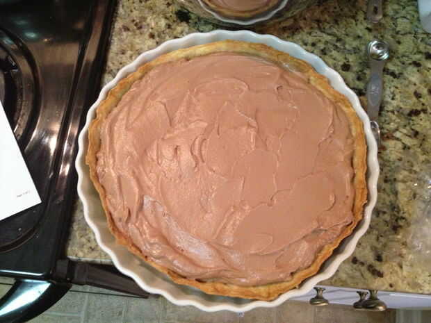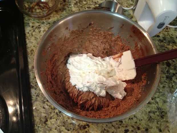 Doblar la nata refrigerada en el chocolate de relleno hasta que no queden rayas blanco visibles. Vierta el relleno en el preparado de la tarta y alisar con una espátula offset. Refrigere por un mínimo de dos horas, pero preferiblemente durante la noche. Decorar la tarta con la crema recién batida o cucharada una cucharada sobre cada rebanada.