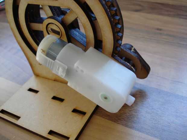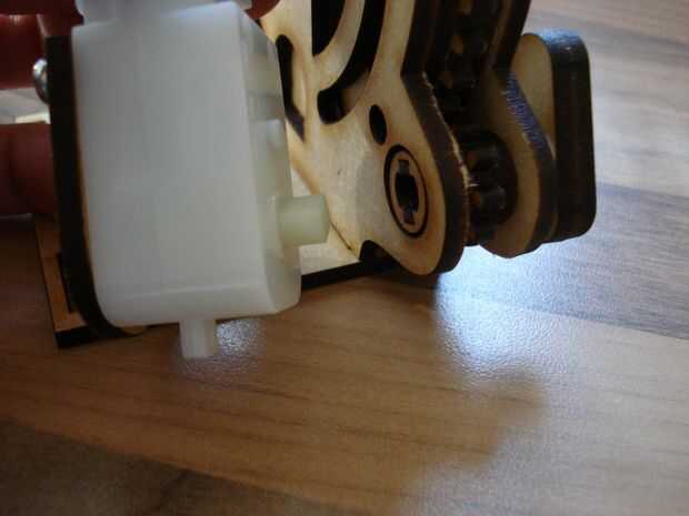 El interior del eje del engranaje pequeño tiene una especialmente una ranura construida para aparearse con el eje del motor. Alinee los dos ejes y empujar juntos. Gire el motor ronda al ángulo correcto.
