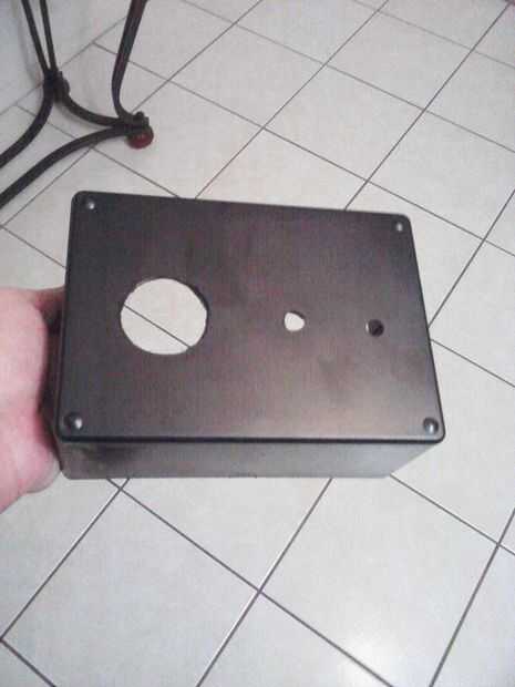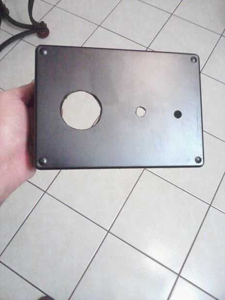 En la parte frontal de tu caja, necesita hacer 3 agujeros para que puede instalar el medidor de potencia de voltaje analógica, conector BNC y el potenciómetro con interruptor. Los agujeros deben de izquierda a la derecha: 1.5", 3/8", 5/16"respectivamente.