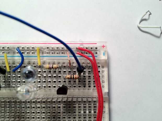 5.) conectar los cátodos (negativo, tiene una pierna más corta, y el lado está marcado con una parte plana para indicar el cátodo) al otro extremo de la resistencia de 47 Ohm y los ánodos (plomo largo, no el cátodo) a + 3, 3V.