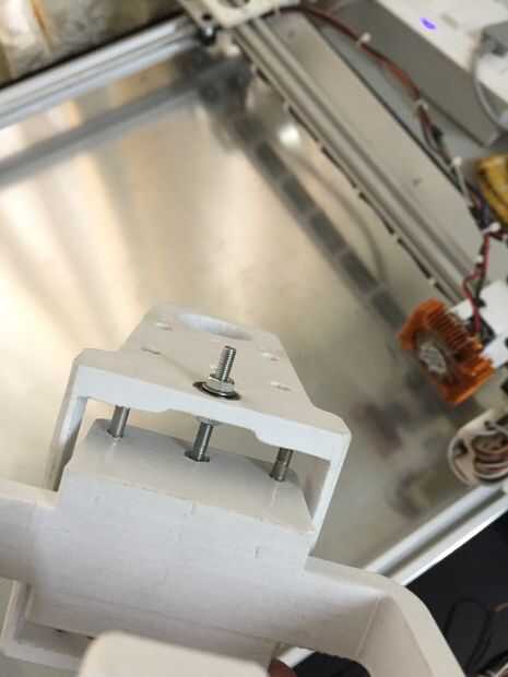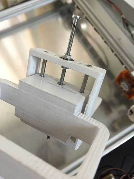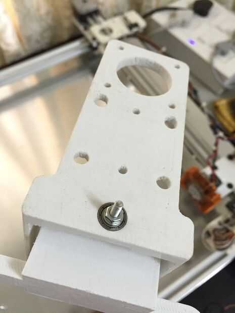 Continuación, inserte un tornillo de M3 de 4 pulgadas por el rodamiento superior y luego por el montaje de láser. El bloque de montaje del laser sí mismo tiene dos ranuras para tuercas M3. Estos también caben perfectamente en los soportes. Gran parte de este montaje es visible una vez que tengas los bloques contigo (lo siento no hay fotos para que). Asegúrese de que tiene dos tornillos M3 en ambos lados del cojinete del tornillo de 4 pulgadas en lugar de bloqueo. Al girar el tornillo de montaje del láser se mueve hacia arriba y hacia abajo en consecuencia. Esencialmente nos hemos convertido en movimiento giratorio en uno lineal, como lo hacen los motores PAP.