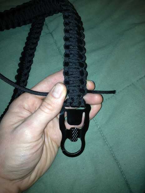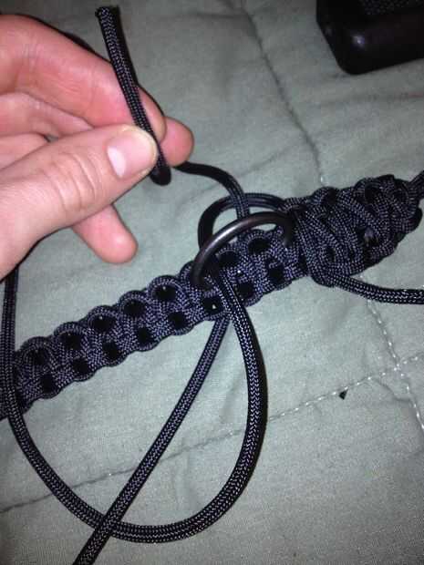 Ahora vamos a espesar para arriba de la eslinga un poco haciendo otra armadura de Cobra sobre la parte superior de la Cobra existente armadura. Esto se llama una armadura del rey Cobra. Quiere iniciar en el extremo trasero de la Honda con este tejido, justo debajo de la anilla. No olvides que están tejiendo sobre una armadura de Cobra existente por lo que va a tomar más paracord esta vez para cubrir la cinta entera. Empecé con una pieza de 100 pies de paracord. He utilizado 8 en el filamento interno, 40 en la primera armadura y usé los restantes 52 pies de la armadura del rey Cobra.