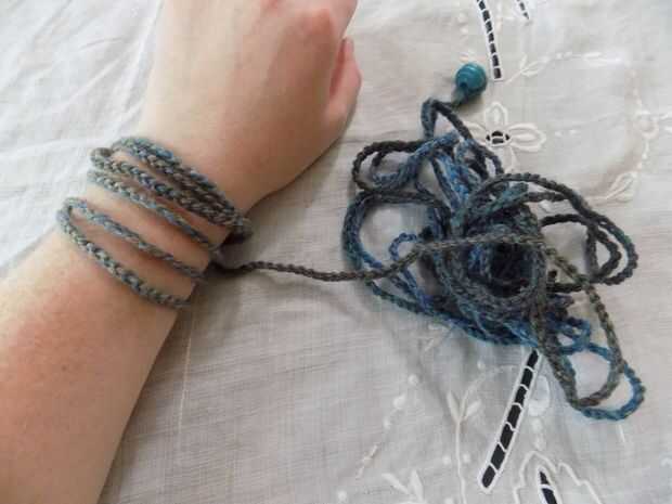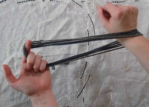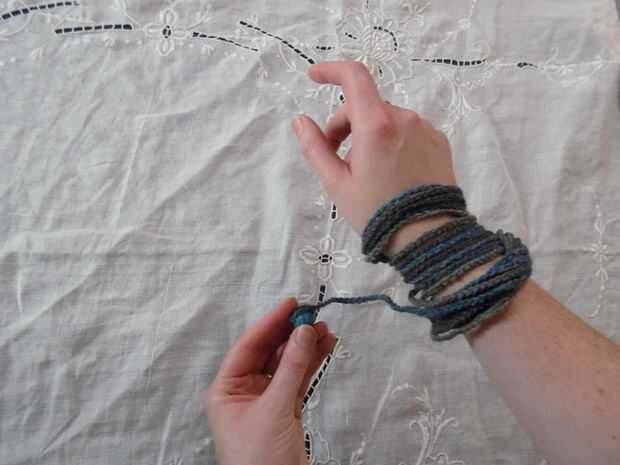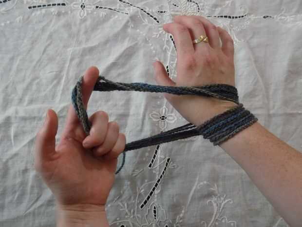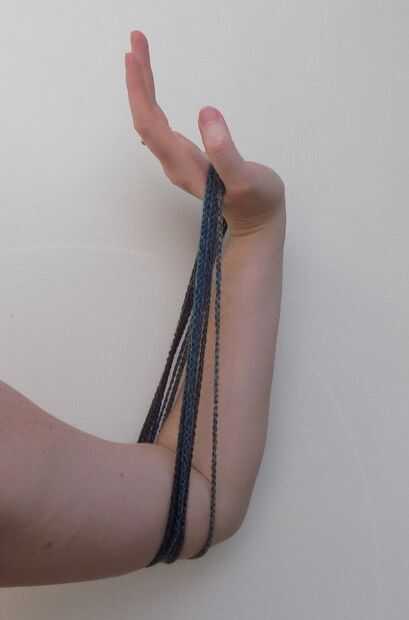 -Comenzar con el lazo alrededor de su mano y brazo como en la imagen base. Enrolle la cadena alrededor de su brazo como si fuera una manguera o cable. Envuelva el paquete resultante alrededor de la muñeca tres veces.
