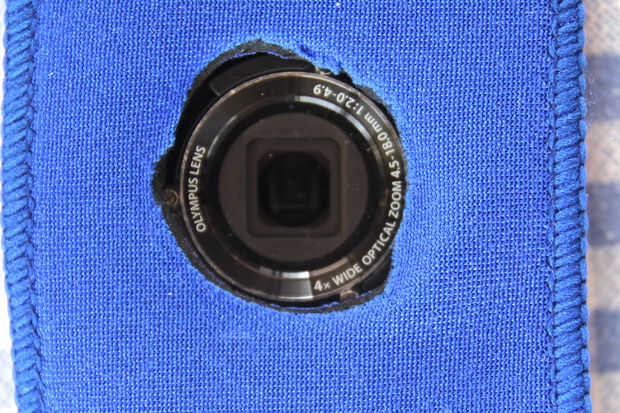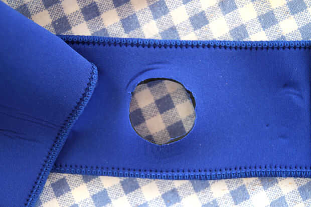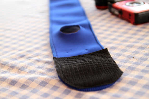 2. hacer un agujero del tamaño de su lente cortando un círculo en uno de los extremos de la banda de neopreno elástico. Es mejor hacer todo cerca del final donde se encuentra el parche de paño negro pegajoso.