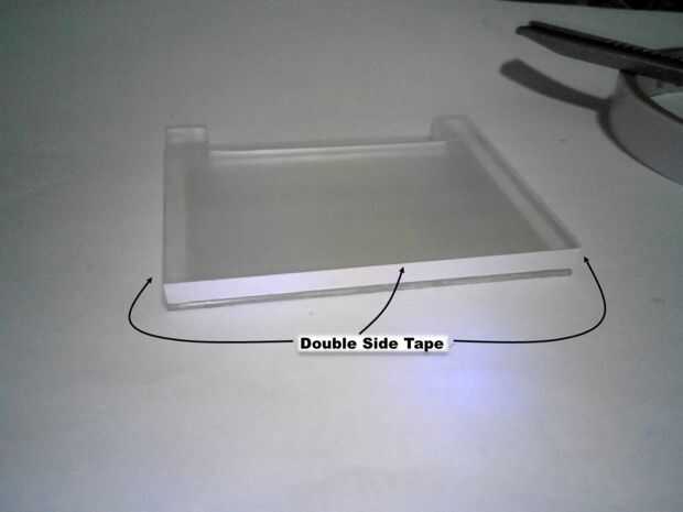 Otra vez con 1 estrecha tira de cinta de doble cara en ambos lados del espejo de 4mm (lado Roughened). Ahora sandwich juntos dos piezas de acrílico con la hoja en el medio. Utilice un palillo de dientes para aplicar fina capa de pegamento o cola de PVC en los lados (frontal, izquierda y derecha).
