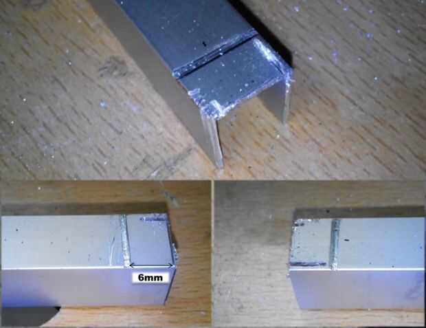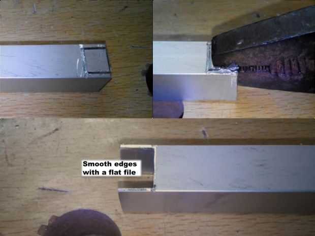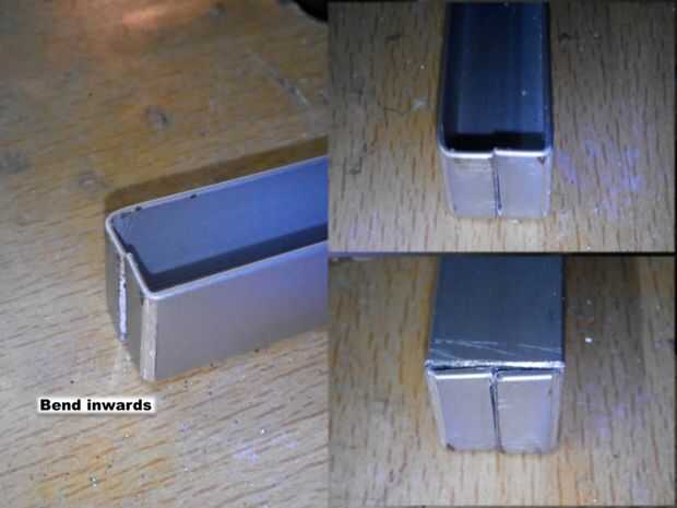 Recortar el borde de ambos extremos y luego doblar hacia adentro de 90° para formar un contenedor. Para hacer precisa y fácil de curva marcar suavemente lo con una sierra para metales. Como aluminio encajará fácilmente este es un intento de tiro.