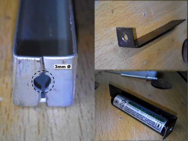 Conseguir una pieza delgada de metal luego doblar el borde 90° para formar una forma de 'L'. Utilice una broca de 3mm para hacer un hueco para volver. Esto es para mantener el resorte terminal y para reforzar el borde de aluminio.