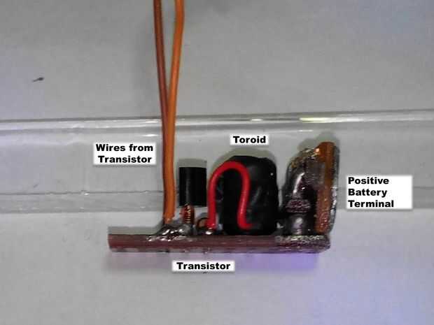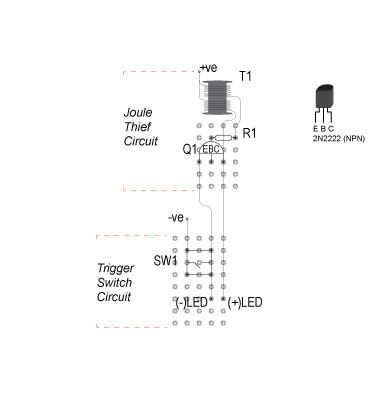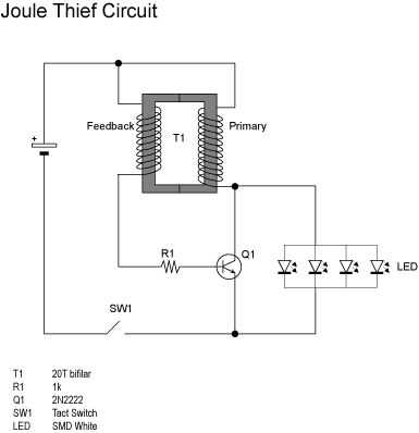 Usé un circuito JT a mi LED. Hay muchos diseños JT. He probado algunas en un protoboard sin soldadura y elegido un circuito que podría iluminar 4 LEDs y componentes mínimos. He descubierto que la clave de componente es el transistor 2N2222.