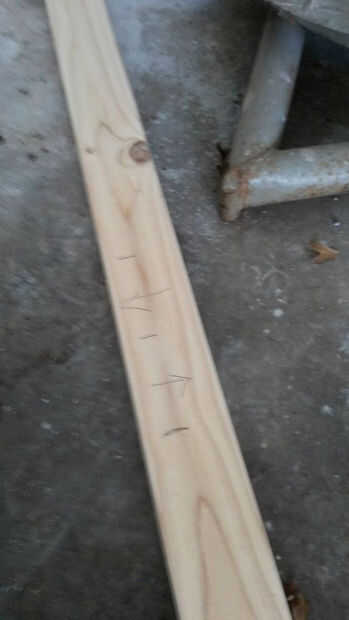 3. decidir sobre la altura de cada estante, mida y marque donde cada estante será el 2x4s en el piso. Imagine que los extremos toquen la pared están la parte inferior. Cuando tuve un estante que se tambaleó, dibujaba flechas indicando la dirección que medida útil para.