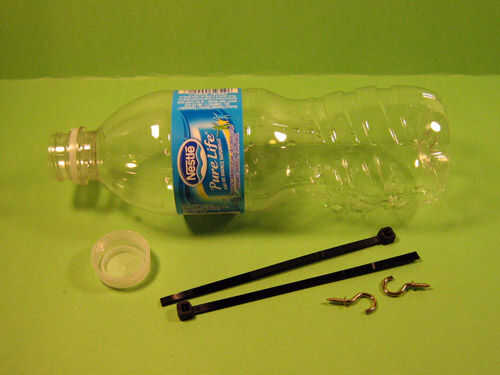 1 botella de agua, cualquier tamaño (la tapa debe ser tan profunda como sea posible mantener a la botella. Tratar de encontrar una gorra de plástico suave, el casquillo blanco era muy difícil de cortar).