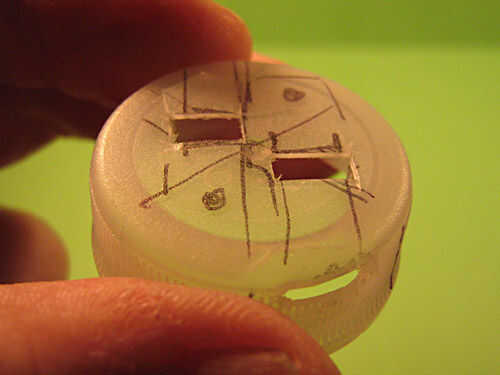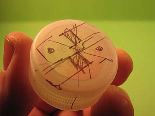Tomar la tapa de la botella y marcar la parte inferior como si usted está cortando un pastel. Dibujar líneas a los lados de las tapas donde quieres aberturas que. Posición de una sujeción de cable (indicados en rojo) en la parte inferior de la botella tapa de modo que salen por la mitad de las 'puertas', les delinear con el marcador. Poner un punto donde el orificio de la abrazadera. Cuando sale de la atadura de cables, corte otra ranura en el lado de la tapa.
