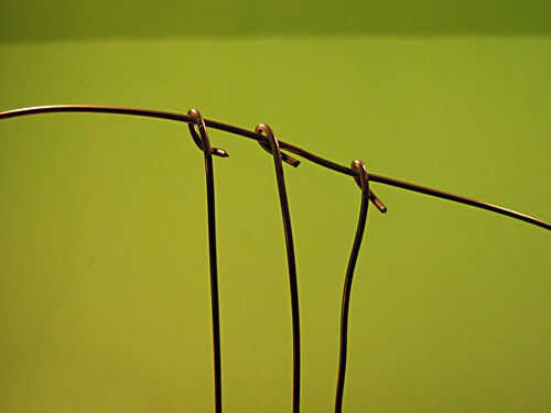 Corte el alambre a la longitud. (Esto dependerá del tamaño de la botella que usted elija. Para una pequeña botella con un canal alrededor de la mitad, poner el collar alambre allí. Para una botella más grande, 1-2qt/L 1-2, hacer el alambre del cuello más pequeño para caber alrededor del cuello de la botella. Añadir un cable adicional cerca de la 'top' para mantener los cables se deslicen hacia los lados). Tomar 3 de los hilos, hacer un pequeño lazo en un extremo y rosca en el cable del collar a través de ellos. Envuelva el alambre del cuello de la botella, deslice los otros cables hasta que se distribuyen uniformemente alrededor de la botella y gire el cable de cuello cerrado. Tire los cables de soporte hacia arriba y girar juntos y formar un gancho.