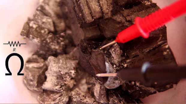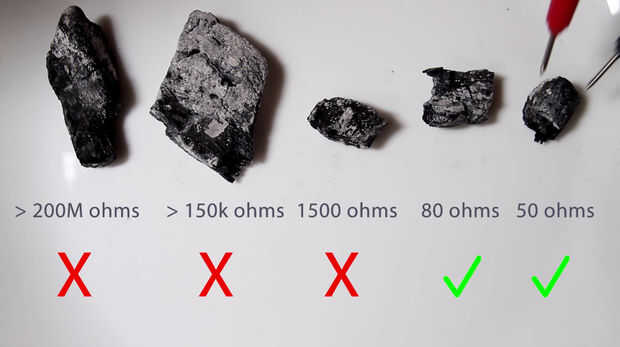Usando un multímetro Digital, medir la resistencia eléctrica de piezas de carbón de leña restos de su chimenea o barbacoa. Elegir las piezas que tienen menos resistencia, la menos resistencia más conductores su tinta y pintura. Seleccionar piezas con menos de 100 ohmios. Algunas piezas no se han quemado completamente y ya que la madera es un buen aislante estos pedazos de carbón no será adecuados para este proyecto.