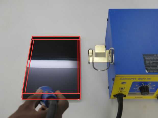 • Comience calentando la parte inferior izquierda del cristal alrededor del borde. Tenga cuidado de sólo aplicar calor para el vidrio que cubre la estructura y no el que cubre la pantalla LCD. Consulte la imagen comentada sobre aclaraciones.