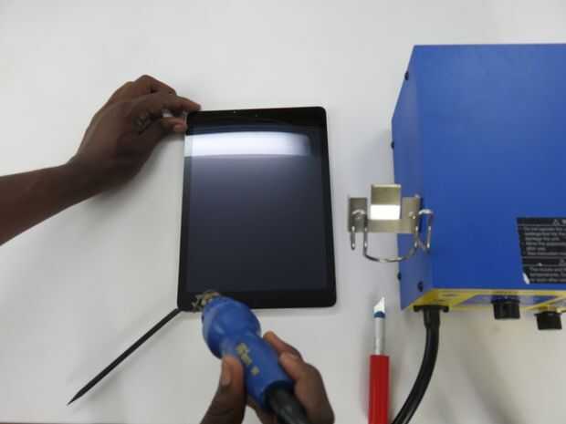 • Comenzar a deslizar el plástico spudger entre la pantalla de vidrio y estructura metálica en la parte inferior del iPad y a lo largo del lado izquierdo. Si encuentras resistencia, aplicar más calor.